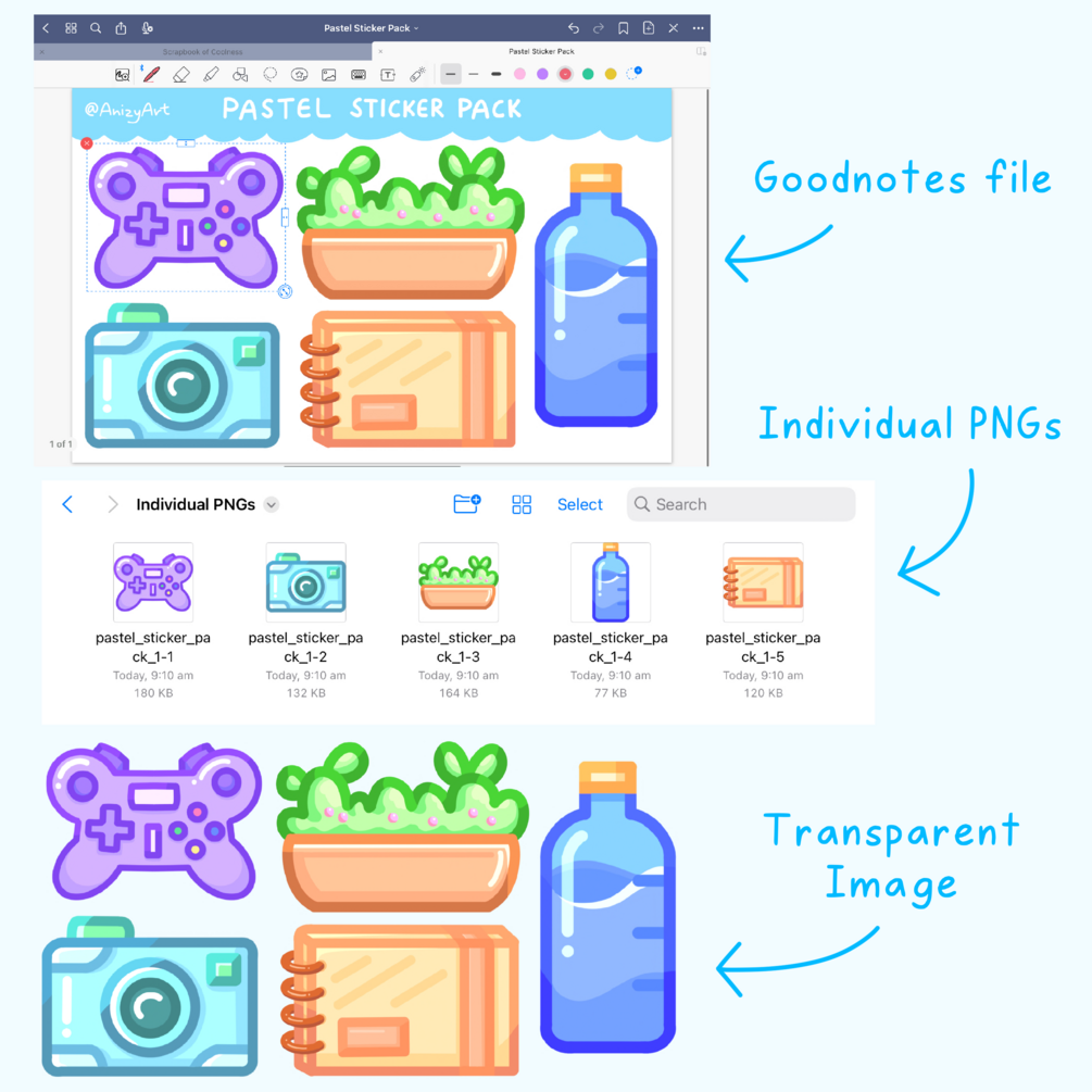 You'll get a Goodnotes file, a zipped folder of the individual PNGs, and a transparent image.