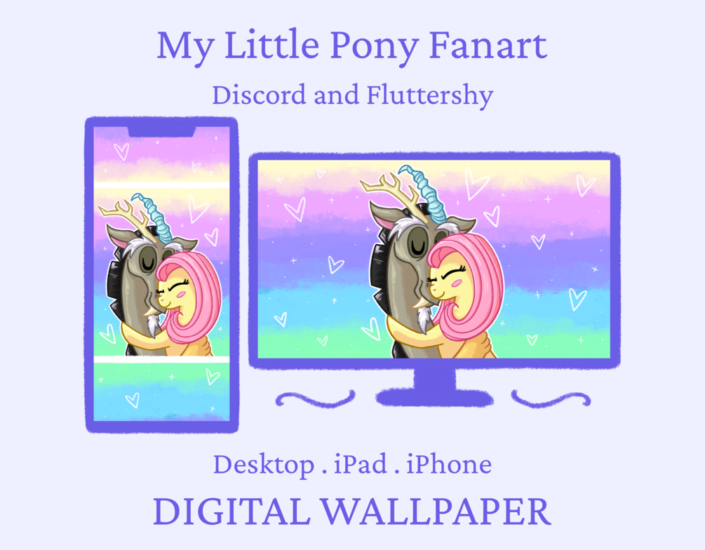 This wallpaper is a My Little Pony fanart of Discord and Fluttershy hugging. You'll get 4 .png wallpapers for desktop, ipad and iphone.